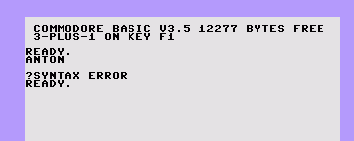 Nun, "?SYNTAX ERROR" heisst in etwas übersetzt: "Das verstehe ich nicht". Der Computer sagt, dass er etwas nicht versteht. Nämlich das, was wir getippt haben: "ANTON". Wie auch. Das verstehen wir ja auch nicht. Das soll ja auch nichts heissen. "ANTON" war ja bloss irgendwas, Unsinn. Wir lernen also: Das ist anders als auf einer Schreibmaschine oder in einem Textprogramm: Der Computer versucht das, was wir schreiben, zu verstehen! Und wenn er es nicht versteht, schreibt er "?SYNTAX ERROR".