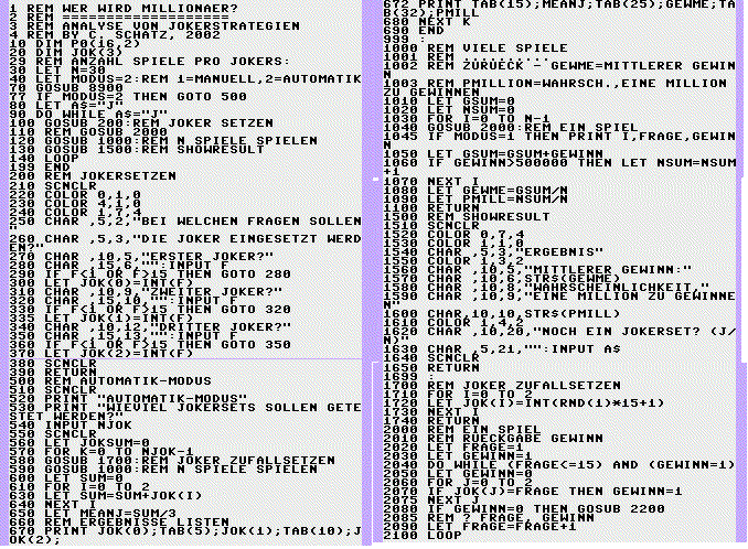 Im Hauptprogramm wird zunächst die Modus-Variable abgefragt, und es wird ggf. in einen speziellen Programmmodus gesprungen. Ansonsten wird eine Schleife betreten, die der Benutzer am Ende der Programmbenutzung mit "N" wieder verlassen kann. Nun werden um Unterprogramm "Joker setzen" die Joker vom Benutzer auf die Fragen gesetzt, in denen sie angewandt werden sollen. Anschliessend "N Spiele spielen" aufgerufen. Das wiederum ruft N-mal "Spiel spielen" auf. Soweit der grobe Aufbau.