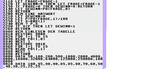 Ich habe zuerst die DATA-Zeilen und die Einleseroutine 8900 bis 9100 geschrieben und getestet. Dann bin ich vom Kern zur Schale vorgegangen, habe also zuerst mit der kleinsten Einheit, der einzelnen Frage in Zeile 2200 angefangen. Man sieht das noch an dem auskommentierten PRINT-Befehl in Zeile 2240. Hier habe ich mir zunächst beim Testen der Routine für jede einzelne Frage p und x, Wahrscheinlichkeit und Würfelergebnis ausgeben lassen. Als das funktionierte, konnte ich die Zeile auskommentieren.