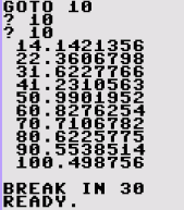1 LET A=10 2 LET B=10 3 PRINT SQR(A^2+B^2) 4 PRINT SQR((A+10)^2+B^2)