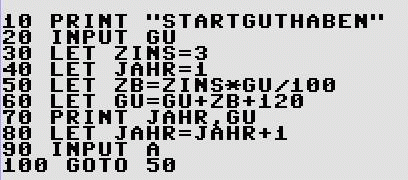 In Zeile 20 bis 40 werden 3 Variablen (Speicher) eingerichtet: GU für das Guthaben, ZINS für den Zins und JAHR für das laufende Jahr. Ab Zeile 50 geht's dann richtig los: