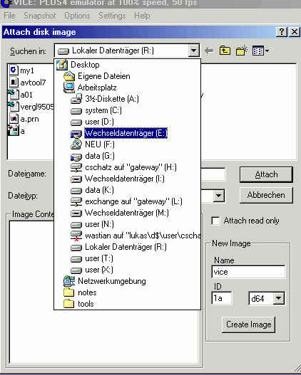 Allerdings funktioniert das nur, falls - wie jetzt - nach dem Starten des Emulators auch eine virtuelle Diskette "attached" wurde. Wollen Sie an Ihre virtuelle Diskette nach einem Neustart des Emulators wieder herankommen, gehen Sie wie oben wieder in das Fenster "Attach disk image", wählen im Dateifenster die Datei "mydisk1", die die virtuelle Diskette verkörpert und gehen auf "Attach". Anschliessend ist die virtuelle Diskette wieder angeschlossen und das LOAD funktioniert.