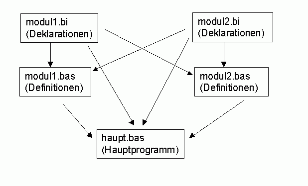 ------------------ 'modul1.bi DECLARE SUB foo1() ------------------ 'modul2.bi DECLARE SUB foo2() ------------------ 'modul1.bas #INCLUDE ONCE "modul1.bi" #INCLUDE ONCE "modul2.bi" SUB foo1() ? "I'm foo1"> END SUB ------------------ 'modul2.bas #INCLUDE ONCE "modul1.bi" #INCLUDE ONCE "modul2.bi" SUB foo2() ? "I'm foo2"> END SUB ------------------ 'haupt.bas #INCLUDE ONCE "modul1.bi" #INCLUDE ONCE "modul2.bi" foo1() foo2() SLEEP