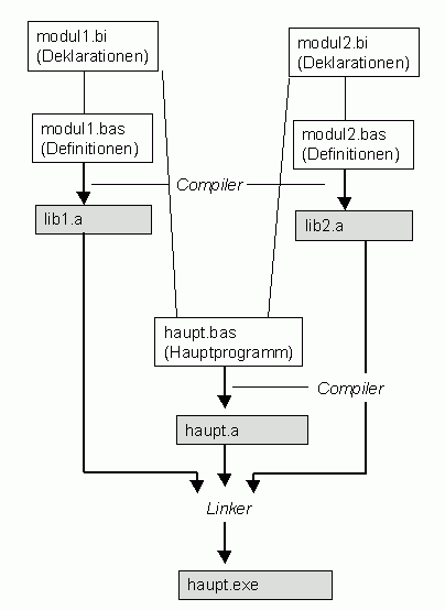 Am obigen Beispiel: Zuerst wird modul1.bas zu lib1.a kompiliert. Dann modul2.bas zu lib2.a. Schliesslich haupt.bas zu haupt.a Der Suffix ".a" kennzeichnet bei FBC eine (Objectcode-)Bibliothek. haupt.bas hat keine #includes von modul1.bas und modul2.bas mehr. Damit aber der Compiler in haupt.bas überhaupt mit den Aufrufen der Routinen aus den externen Modulen (foo()) etwas anfangen kann, müssen die entsprechenden Deklarationen eingebunden sind, also modul1.bi und modul2.bi.