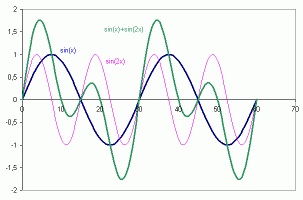 In diesem Diagramm sehen wir das Ergebnis, wenn wir zwei Sinuswellen verschiedener Frequenz addieren. Man sagt dazu auch "Überlagern". Wenn unser Ton also nicht nur so ein unangenehmer öder Sinuston sein, sondern eher etwas von einer Flöte, Geige oder einer Trompete annehmen soll, dann müssen wir Sinuswellen höherer Frequenz auf die Grundkurve draufaddieren. Allerdings nicht beliebiger Frequenz: Damit es ein Klang bleibt, müssen diese zusätzlichen Wellen ganzzahlig vielfache Frequenzen der Grundwelle haben, also sin(2x), sin(3x) usw... Man nennt das "Oberschwingungen". Dabei muss die "Höhe" der jeweiligen zusätzlichen Oberschwingung , die s.g. Amplitude., nicht zwangweise gleich der Grundwelle sein - im Gegenteil. Die Wahl der Amplituden der Oberschwingungen macht den Charakter unseres Klangs aus.