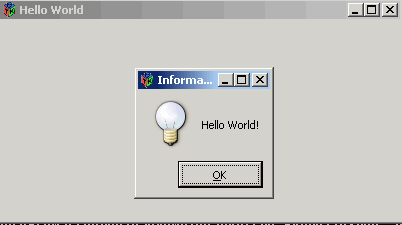 option EXPLICIT #INCLUDE ONCE "gtk/gtk.bi" #define NULL 0 DIM AS GtkWidget PTR win DIM AS GtkWidget PTR message_dialog DIM AS INTEGER i DIM AS ZSTRING * 128 buf gtk_init( NULL, NULL ) '' create a NEW WINDOW win = gtk_window_new( GTK_WINDOW_TOPLEVEL) gtk_widget_set_usize( win, 400, 200 ) gtk_window_set_title( win, "Hello World" ) buf="Hello World!" message_dialog=gtk_message_dialog_new(win,0,GTK_MESSAGE_INFO,GTK_BUTTONS_OK,buf) gtk_widget_show( win ) gtk_widget_show(message_dialog) gtk_main( ) END 0erzeugt folgenden netten Output: