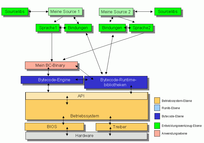 Was auch immer ich ansteuere, die Komponenten, Runlibs, Toollibs und Sourcelibs werden letztendlich die API benutzen, welche den Betriebssystemkern benutzt, welcher BIOS und Treiber benutzt, um schliesslich auf der Hardware das zu realisieren, was realisiert werden soll.