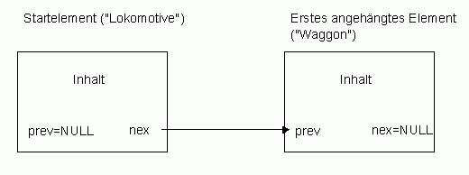 start=ALLOCATE(tomalist_element) IF (start=0) THEN brkmess("War nix") 'Jetzt koennen wir in start etwas speichern: start->cont="Teststring Lok" 'Nicht vergessen! Gleich alle Leerzeiger mit NULL-Stoepsel versehen! start->prev=NULL 'Und nun gibts ein neues Element start->nex=ALLOCATE(tomalist_element) start->nex->cont="Teststring 1. Waggon" 'Und gleich die Zeiger richtig verketten: start->nex->prev=start 'Kein 2. Waggon bisher start->nex->nex=NULL